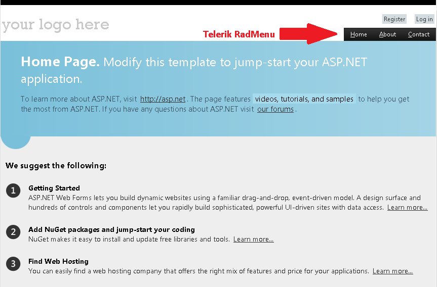I started my experience with the controls by jumping right in to starting a new WebForms project. My first attempt to use a control was to replace the default menu with the RadMenu. To accomplish this, I dragged the RadMenu directly from the