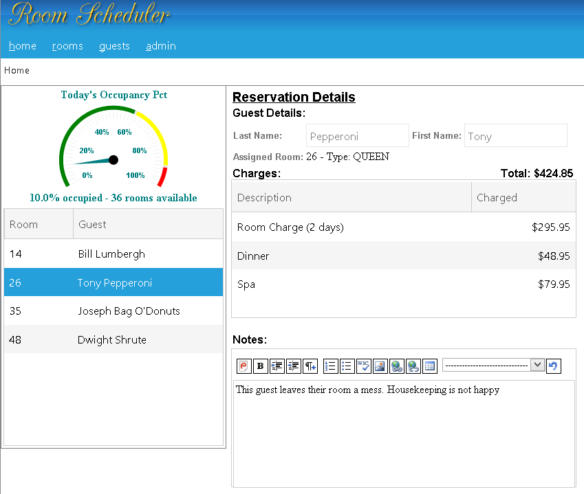 <asp:Panel ID="reservationDetailsPanel" runat="server" CssClass="detailsPanel" Visible="true" ClientIDMode="Static" ><asp:Label runat="server" ID="lNoReservationSelected" CssClass="NoReservationSelected" Text="No Reservation Currently Selected"></asp:Label><asp:Literal runat="server" ID="lReservationDetails"><h3>Reservation Details</h3></asp:Literal><asp:Literal runat="server" ID="lDetails"><h4>Guest Details:</h4></asp:Literal><table> <tr> <td> <asp:Label runat="server" ID="lblLastName" Width="150" AssociatedControlID="txtLastName">Last Name:</asp:Label> </td> <td> <telerik:RadTextBox runat="server" ID="RadTextBox1" Width="150" Enabled="false"></telerik:RadTextBox> </td> <td> <asp:Label runat="server" ID="lblFirstName" Width="150" AssociatedControlID="txtFirstName">First Name:</asp:Label> </td> <td> <telerik:RadTextBox runat="server" ID="RadTextBox2" Width="150" Enabled="false"></telerik:RadTextBox> </td> </tr> <tr> <td> <asp:Label runat="server" ID="lblAssignedRoom" AssociatedControlID="assignedRoom">Assigned Room:</asp:Label> </td> <td colspan="3"> <asp:Label runat="server" ID="assignedRoom"></asp:Label> </td> </tr></table><div id="chargesHeader"> <asp:Literal ID="lCharges" runat="server"><h4>Charges:</h4> </asp:Literal> <asp:Literal ID="lTotalCharges" runat="server"><h4>Total: </h4></asp:Literal></div><br /><%-- Grid of Charges goes here --%><br /><asp:Literal ID="lNotes" runat="server"><h4>Notes:</h4></asp:Literal><%-- Editor for Notes goes here --%></asp:Panel>The content of this panel is a collection of standard ASP.Net controls and layout with a few RadTextBoxes thrown in to make things interesting. The more interesting parts start with the grid of room charges we will place in the middle of the panel. I will place a standard RadGrid here and configure two columns, one for the charge description and one for the value associated with the charge. With the minimal amount of configuration that I am doing for this grid, I will write this code by hand in the source editor: