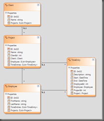 For this example, I will be building a sample project tracker to track clients, projects, employees, and timesheets.  We have many resources available (video, blog, documentation) which show how to create a model using the Visual Designer; so I won’t be focusing on that aspect in this blog.