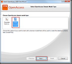 First thing we need to do is create a solution, and add a class library to it.  The class library will hold our model, so add a new “OpenAccess Domain Model”.  I will build this using forward mapping, so I selected “Empty Domain Model” from the OpenAccess dialog: