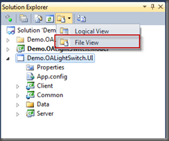If you look at the compiler errors, you may notice that two of the errors are in a project named “ServerGenerated.” This may be confusing at first because when you look in the Solution Explorer there isn’t a project with that name! Behind the scenes LightSwitch created a number of projects for us, and they are not visible by default. To see these projects, select your LightSwitch application in the Solution Explorer, and change the current view from “Logical” to “File” in the top menu.