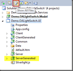 Now we can see all the projects LightSwitch created, and there is still not one named “ServerGenerated.” Where is it?! To access the “ServerGenerated” project, click the “Show All Files” button at the top of the Solution Explorer, and viola!