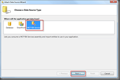 Here you will be presented with a dialog allowing you to select an existing Database, SharePoint, or Ria Services as a data source. Select Ria Service, and click Next.