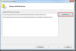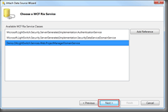 Now we can choose the Ria Service we would like to use as a data source, LightSwitch provides implementations for AuthenticationServices, and SecurityServices out of the box, but we won’t mess with those right now.