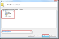 The next screen allows you to select which entities you would like to include, and you can name the data source. Once you have done this click Finish.