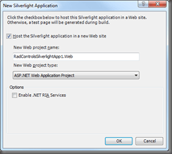 Visual Studio will now ask if you would like to host the new Silverlight application in a web site; select the web project type you prefer.