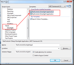 Next create a new project in Visual Studio. In the “Project Type” section, select “Telerik,” and then choose the Silverlight template of your choice (VB/C#)