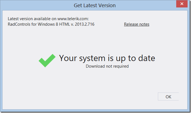 The Download button checks to see if there is a more recent version of the RadControls for Windows 8 HTML available. If your version is the latest, you will receive a dialog similar to Figure 7. If there is an updated version, you will have an opportunity to download and install it before continuing.