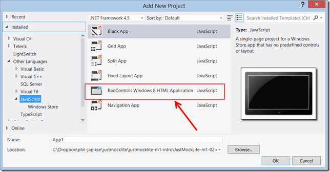 If you are new to Windows 8 HTML/WinJS development, seeing all of those different templates and options can be daunting. At the end of the day, it’s pretty clear. To get the most out of you application, start with the RadControls Windows 8 HTML Application Template.