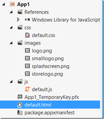 After you create the project, your solution explorer will look like Figure 2. There is one reference (the Windows Library for JavaScript), one main CSS file, one JavaScript file, one HTML file, several images, an application key, and an application manifest. What we care about are the references, and the default HTML file. The rest of the project is beyond the scope of this post.