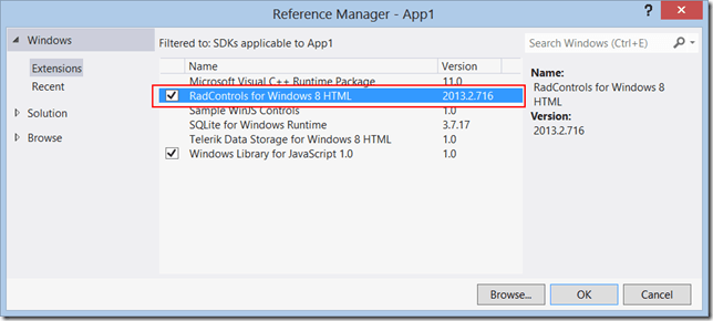 The first thing that we need to do is add the reference for the RadControls for Windows 8. Right click References, select “Add Reference…” and select Windows –> Extensions and check the box next to the RadControls for Windows 8 HTML as shown in Figure 3. NOTE: Your version number might be different than the one shown in the figure.
