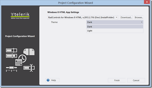 This will start the new application wizard that allows you to select the version of RadControls for Windows 8 HTML (if you have more than one installed) and select the Light or Dark theme, as shown in Figure 6. Selecting the theme will set both the Windows 8 theme and the RadControls theme. If you want them to be different (like I described above), select the light theme here and then change the WinJS theme manually.