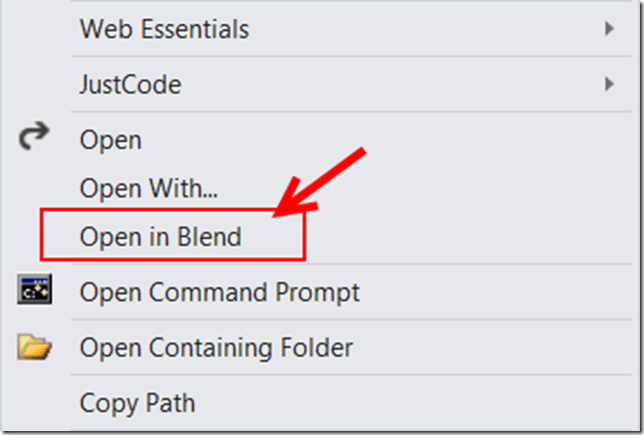 There are two ways to add controls to an HTML page – either typing the controls by hand or using Blend. I use Blend the majority of the time to add controls to my pages since the resulting code is the same as if I typed it, and it’s easier in Blend. To open your page in Blend, simply right click on home.html, and select Open in Blend (as in Figure 1).