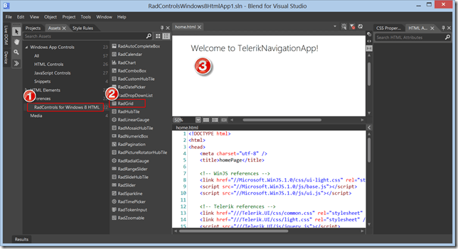 Once you have your project open in Blend (as shown in Figure 2), it’s very easy to add WinJS controls to your page. On the left hand side under the “Assets” tab are all of the available controls, snippets, and media available to you. Clicking on References –> RadControls for Windows 8 (#1) will show all of the RadControls. Select the RadGrid (#2) and drag it onto the page (#3).