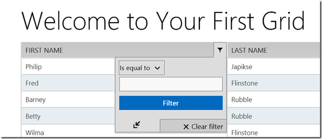 Filtering is enabled by adding a single property – “filterable”. It is customizable as well, from selecting which columns can or cannot be filtered, to custom filtering. The single line of code is shown in Listing 9. NOTE: Since we did not specify the data type of the fields in the schema, all fields are strings. See this post for more information on Formatting Columns and Specifying Data Types.