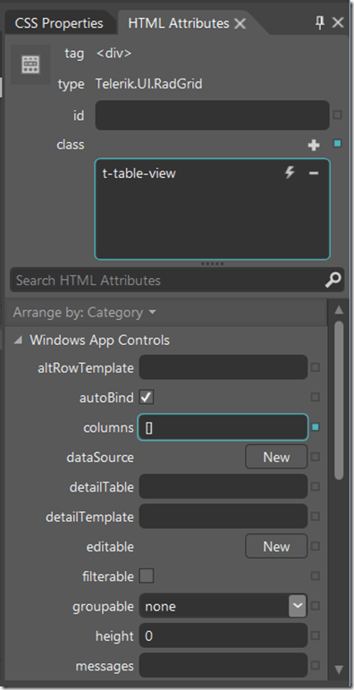 In addition to easily adding controls to your page, Blend creates property pages for well written controls, and the RadControls take full advantage of this. To open up the property pages, click the control in the live DOM window (on the left) or click the element in the HTML editor (the window in the middle of the IDE). Figure 3 shows the properties page for the HTML Attributes for the RadGrid I just added to the page. Updating values in the properties page will update the “data-win-options” values for the control.