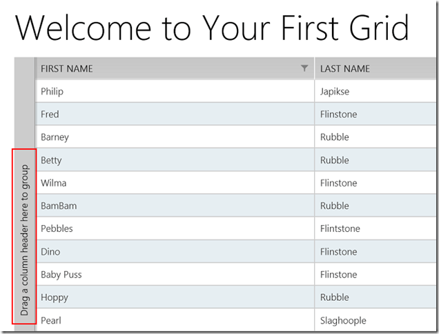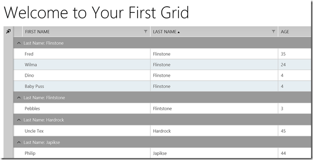 After dragging the Last Name column over to the grouping area, the grid will show the data grouped as in Figure 10.