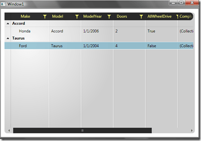 This area is officially called the GridViewGroupPanel, but I am just going to call it the Group Panel to save myself some typing.  The Group Panel allows the user to drag and drop column headers into the panel in order to group the data in the RadGridView at runtime.  Below you will see that I have grouped my data by the "Make" column in my grid of vehicles.