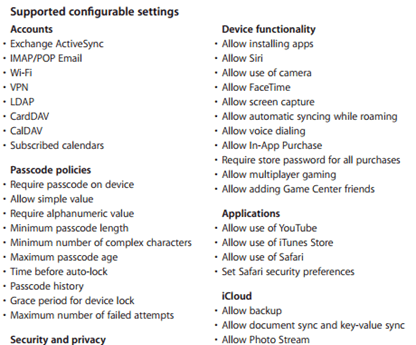 To the right is a screenshot from Apple's MDM Document showing some of what is possible just in terms of locking things down. And much more than this is possible if you are so inclined.