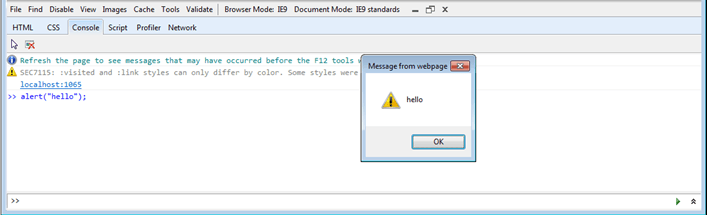 Run the application again.  When it comes up, open the developer tools by selecting F12.  Switch to the Console tab in the developer tools.  The console allows a developer to execute arbitrary JavaScript commands at runtime.  As a test, type alert(“Hello!”); in the console and press enter.