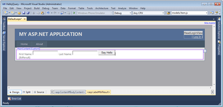 Select both the first name and last name textboxes and store their values in variables.  Lastly, the lblResult control renders as a <span>  tag at runtime.  In order to set the text that’s rendered inside of the span tag, select the lblResult control with jQuery and set its html property.