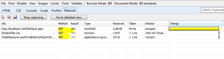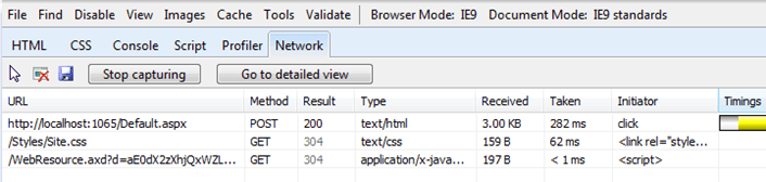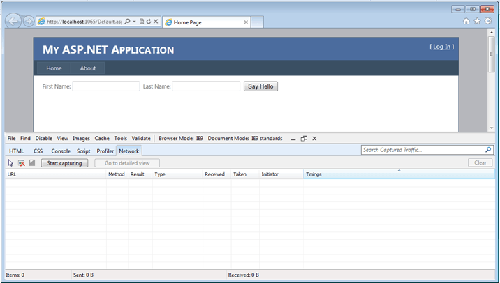 Press F5 or the run icon and run the application.  Don’t enter in your name yet or click the button.  Instead, press F12 to open the IE Developer Tools.  Switch to the Network tab and click the Start Capturing button.