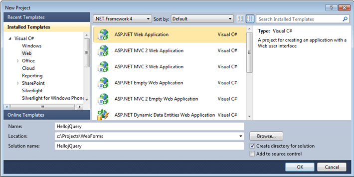 Select File / New Project and select the ASP.NET Web Application project template.  Name the application “HellojQuery”.