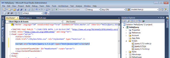 Open up the Site.Master page.  Drag the full jQuery source into the head of the page, directly below the link tag to Site.css.  This will create a new link tag pointing to the jQuery-1.7.2.js file.  JQuery has now been added to the project.