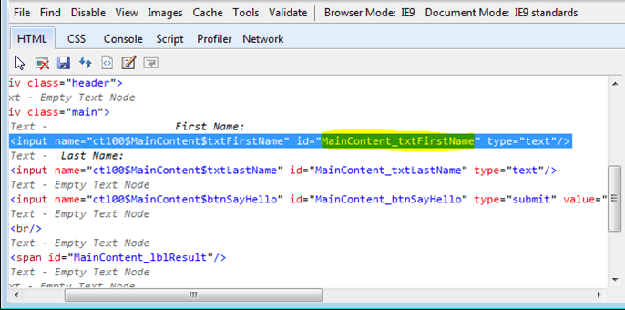 To debug why this didn’t work, click on the white arrow which is the element selector.  Then go up into the page and click on the textbox that you named txtFirstName.  The HTML tab will open and the element in the page will be highlighted.  Notice that it’s ID is not txtFirstName, but rather MainContent_txtFirstName.  This is because the controls were added to a content container in Default.aspx.  In ASP.NET WebForms, controls added to a parent server control will be prefixed with the parent name.  If parents are nested within parents, they may have multiple values appended onto the front.  This is to make sure that ID’s do in fact remain unique.