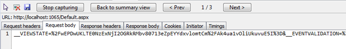 In ASP.NET WebForms, the page posts back to itself, or the same URL. To inspect the information that was sent to the server, double click on the POST method and click on the Request Body tab.