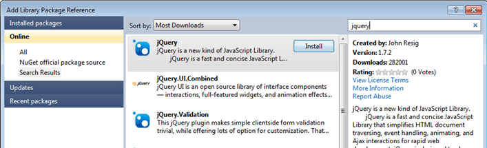 To install jQuery from Nuget, right-click the project and select Add Library Package Reference.  Select Online from the left-hand side and enter “jquery” in the search box.  Click the Install button on the jQuery package.  This will install the VSDoc files as well.  There is no need to install them separately.