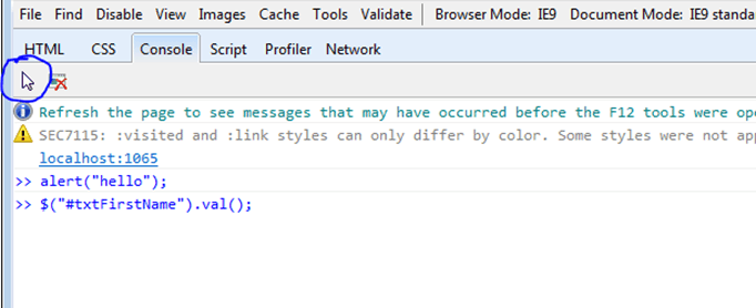 To select the First Name textbox value in this project, remember that you set the ID earlier in this tutorial to txtFirstName.  You then need to call the jQuery val() method to retrieve the text inside of the textbox.  Enter the following command in the console and press enter.
