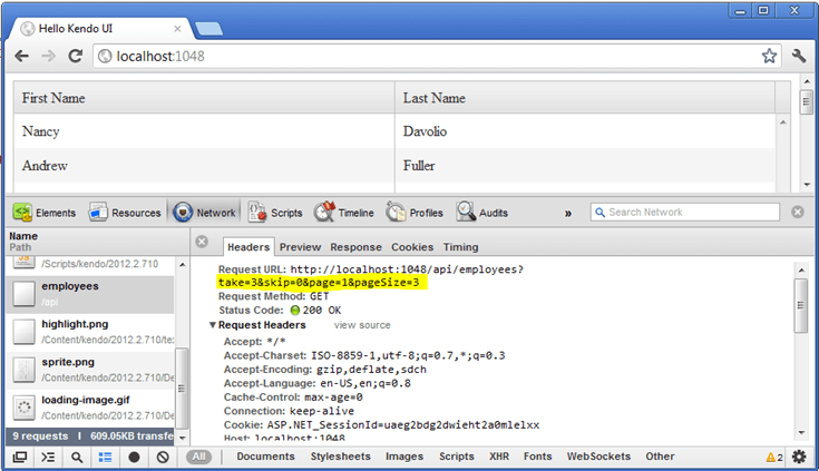 An inspection of the request in the DevTools reveals that Kendo UI is now sending take, skip and pageSize parameters back to the WebAPI service. You need to handle these parameters in the method on the server.