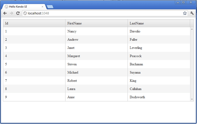 Kendo UI automatically creates columns for each of the data items and assigns the field name as the column header. We want to change this to make it more user friendly. Specifically, we don’t need to display the Id, and we want to format the First Name and Last Name columns so they display headers in spaced title case. Right now they are title cased, but there is no space.