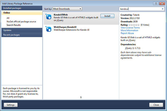 Add Kendo UI to your project by installing it from NuGet. This will also install jQuery. Right-click the project and select add library package reference . Select online from the left-hand side and search for kendoui. Select the package and choose install.