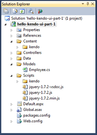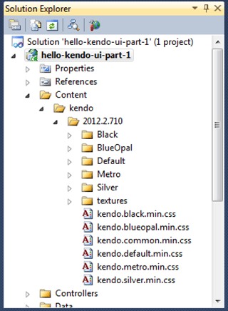 Notice that you now have a Content folder that contains a kendo subfolder. You also have a Scripts folder which also has a kendo subfolder.