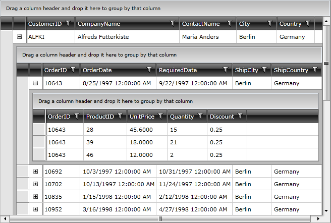 </telerik:RadGridView.Columns> <telerik:RadGridView.ChildTableDefinitions> <telerik:GridViewTableDefinition /> </telerik:RadGridView.ChildTableDefinitions> <telerik:RadGridView.HierarchyChildTemplate> <DataTemplate> <telerik:RadGridView ItemsSource="{Binding OrderDetailsCollection}" AutoGenerateColumns="False"> <telerik:RadGridView.Columns> …