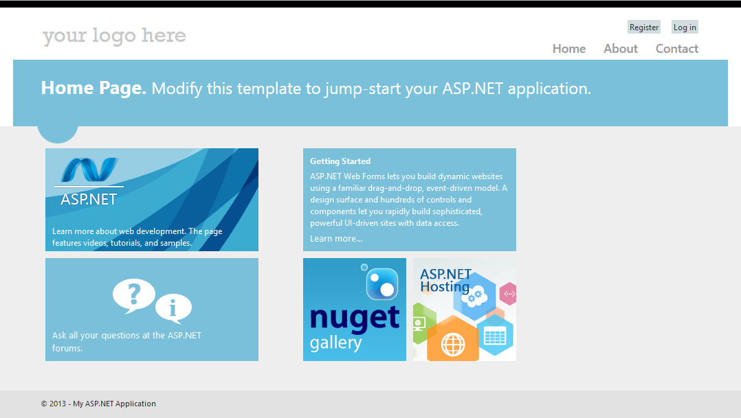 <telerik:RadTileList ID="TileList1" runat="server" TileRows="2" Skin="Metro"> <Groups> <telerik:TileGroup> <telerik:RadImageAndTextTile ImageUrl="Images/tile_asp.net.png" BackColor="#7AC0DA" Target="_blank" NavigateUrl="http://asp.net" Shape="Wide" Text="Learn more about web development. The page features videos, tutorials, and samples."> </telerik:RadImageAndTextTile> <telerik:RadIconTile BackColor="#7AC0DA" NavigateUrl="http://forums.asp.net/18.aspx" Target="_blank" Shape="Wide" Title-Text="Ask all your questions at the ASP.NET forums." ImageUrl="Images/tile_webforms_icon.png"> <PeekTemplateSettings AnimationDuration="1000" ShowPeekTemplateOnMouseOver="true" HidePeekTemplateOnMouseOut="true" /> <PeekTemplate> <img src="Images/tile_webforms.png" alt="" /> </PeekTemplate> </telerik:RadIconTile> </telerik:TileGroup> <telerik:TileGroup> <telerik:RadContentTemplateTile BackColor="#7AC0DA" NavigateUrl="http://go.microsoft.com/fwlink/?LinkId=245146" Target="_blank" Shape="Wide" Title-Text="Learn more..."> <ContentTemplate> <div style="margin: 0px 10px 0px 10px;"> <h5 style="color: white; margin: 10px 0px 5px 0px;">Getting Started</h5> ASP.NET Web Forms lets you build dynamic websites using a familiar drag-and-drop, event-driven model. A design surface and hundreds of controls and components let you rapidly build sophisticated, powerful UI-driven sites with data access. </div> </ContentTemplate> </telerik:RadContentTemplateTile> <telerik:RadImageAndTextTile Text="Add NuGet packages and jump-start your coding." BackColor="#7AC0DA" NavigateUrl="http://go.microsoft.com/fwlink/?LinkId=245147" Target="_blank" ImageUrl="Images/tile_nuget_icon.png"> <PeekTemplateSettings ShowInterval="5000" Animation="Slide" ShowPeekTemplateOnMouseOver="true" HidePeekTemplateOnMouseOut="true" /> <PeekTemplate> <img src="Images/tile_nuget.png" alt="ASP.NET hosting" /> </PeekTemplate> </telerik:RadImageAndTextTile> <telerik:RadImageTile BackColor="#7AC0DA" NavigateUrl="http://go.microsoft.com/fwlink/?LinkId=245143" Target="_blank" ImageUrl="Images/tile_hosting.png"></telerik:RadImageTile> </telerik:TileGroup> </Groups></telerik:RadTileList>Review the final look of the Home page in Figure 9.