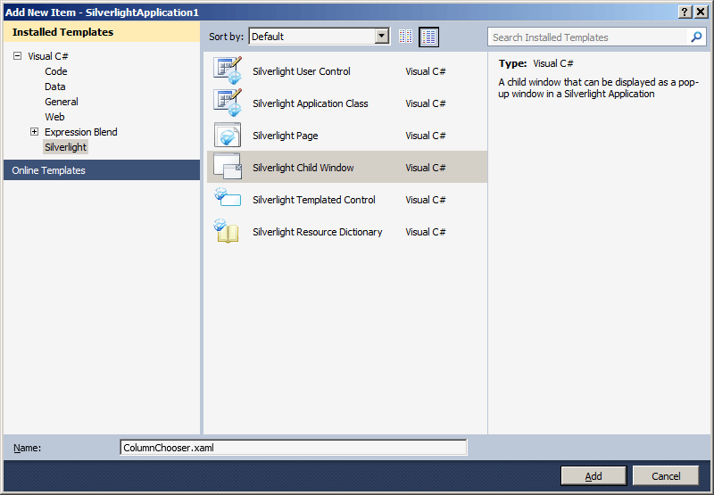 public partial class ColumnChooser : ChildWindow { public ColumnChooser(RadGridView grid) { InitializeComponent(); this.DataContext = grid; } }