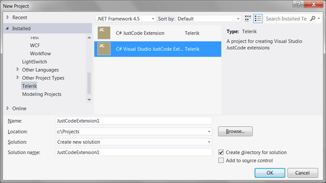 To get started, open the Create New Project dialog and navigate to the Telerik options under Installed. Select C# Visual Studio JustCode Extension. The previous project type, C# JustCode extension, is still available for backwards compatibility.