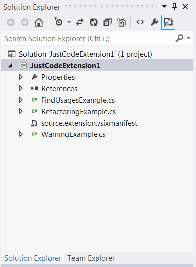 Give your new extensions project a name, choose the location, then press OK. A project is created based on our new template. It has several example extensions included to help guide you. The difference with the old approach is that instead of building a DLL it now builds a VSIX package (which is a Visual Studio extension) that contains the extension module. JustCode loads all extensions of this kind so you can now easily distribute your JustCode extensions using the Visual Studio Gallery.