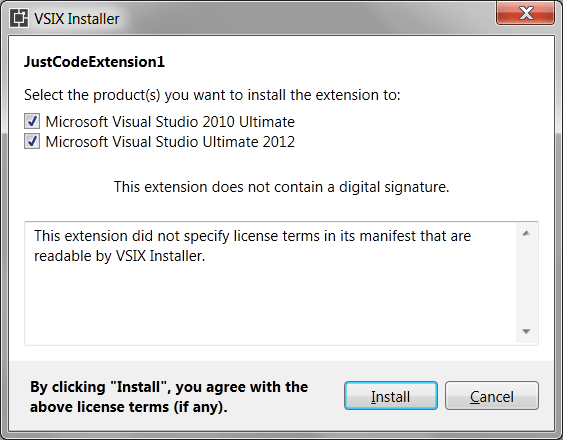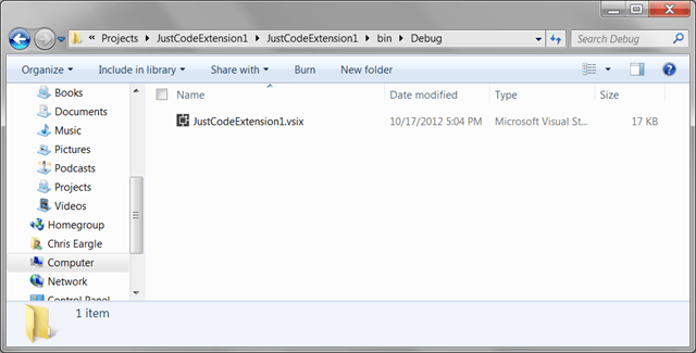 After you have created your custom features for JustCode, compile the solution. A VSIX package is created in the bin folder.