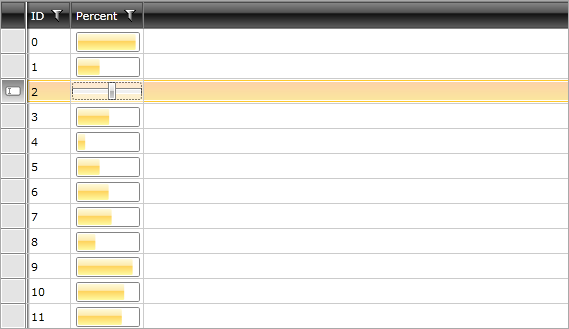 public class GridViewPercentageColumn : GridViewDataColumn { public override FrameworkElement CreateCellElement(GridViewCell cell, object dataItem) { var bar = cell.Content as RadProgressBar; if (bar == null) { bar = new RadProgressBar(); bar.Height = 20; bar.SetBinding(RadProgressBar.ValueProperty, this.DataMemberBinding); cell.Content = bar; } return bar; } public override FrameworkElement CreateCellEditElement(GridViewCell cell, object dataItem) { var slider = new RadSlider(); slider.Maximum = 0; slider.Maximum = 100; slider.SmallChange = 1; slider.LargeChange = 10; slider.SetBinding(RadSlider.ValueProperty, this.DataMemberBinding); return slider; } }