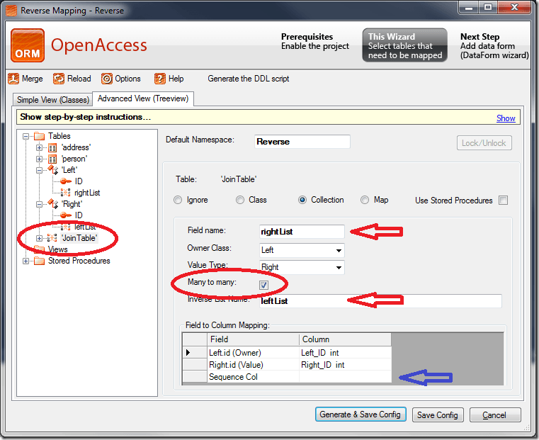 To generate the classes with the reverse engineering wizard (tables to classes) go to the advanced view. After selecting the ‘Join Table’ node it is possible to specify that this is an ‘Many to many’ association by setting the checkbox. The names of both lists can be specified as well.