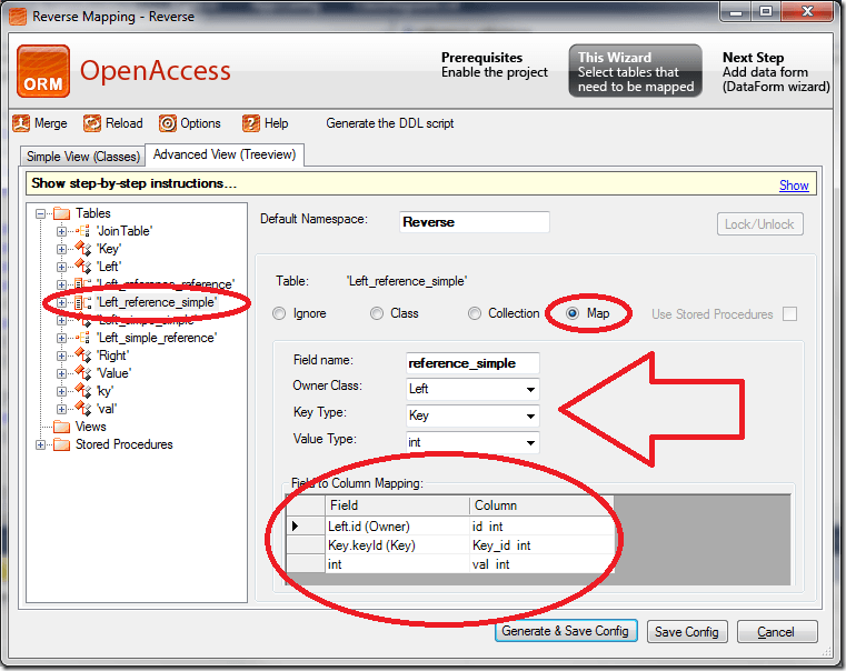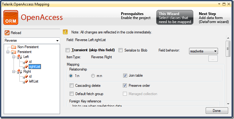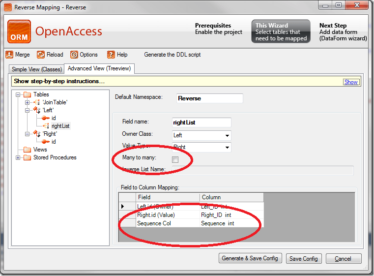 As you can see in the reverse mapping dialog a ‘Sequence column’ can be used as well. A sequence column can be used to preserve the order of a collection. The name of the checkbox in the forward mapping wizard is ‘Preserve order’ to express it. In the forward case you need an additional column in the join table to keep the information about the position of each entry in the master collection. If the wizard finds this entry it is mapped automatically. In forward case you have to select ‘Preserve order’.