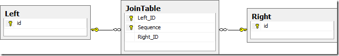 Let’s start with a simple join table in the database schema. Typically a join table contains two foreign key references, one to the left and one to the right table.