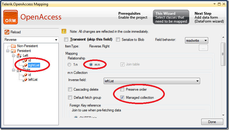 In the forward mapping (classes to tables) the two classes Left and Right have to be implemented including their collections. In the forward mapping wizard the selected field represents the slave role. First you have to select the m:n option to specify the association type. Unselecting the ‘Preserve order’ checkbox and selecting of the ‘Managed collection’ checkbox results in the described database schema. The join table and its column names can be specified if you scroll down in this dialog.