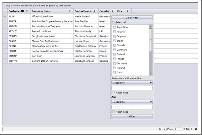 private void RadGridView1_DistinctValuesLoading(object sender, Telerik.Windows.Controls.GridView.GridViewDistinctValuesLoadingEventArgs e) { var collection = new RadObservableCollection<string>(); e.ItemsSource = collection; var context = (NorthwindDomainContext)DomainDataSource1.DomainContext; context.DistinctValues.Clear(); context.Load(context.GetDistinctValuesQuery(e.Column.UniqueName)).Completed += (s, args) => { collection.AddRange(context.DistinctValues.OfType<DistinctValue>().Select(dv => dv.Value)); }; }