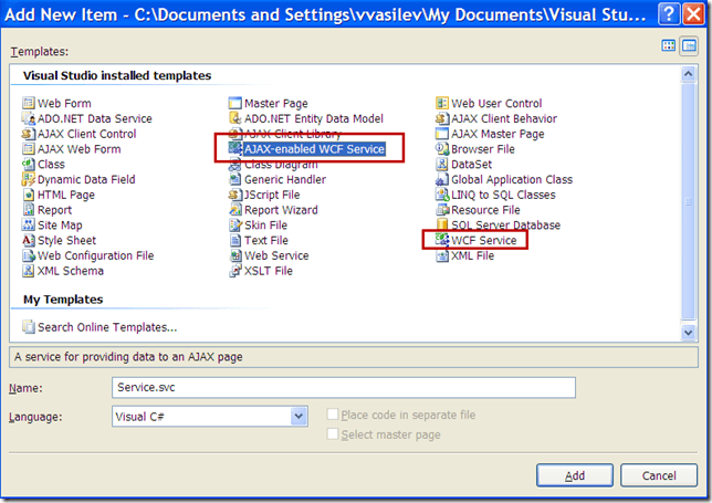 3. Add the WCF service – right click on your project in the Solution Explorer and select Add New Item. This is important: select the Ajax-enabled WCF service option (do not mix it with WCF Service):