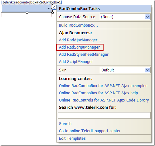 2. Drag RadComboBox from your toolbox. From the SmartTag click on the Add RadScriptManager link. It will automatically register the handler in the web.config file.